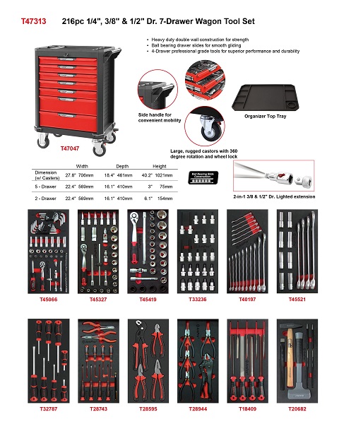 Тележка инструментальная (красная) с набором инструмента 216 пр. в мягких ложементах, 7 ящиков